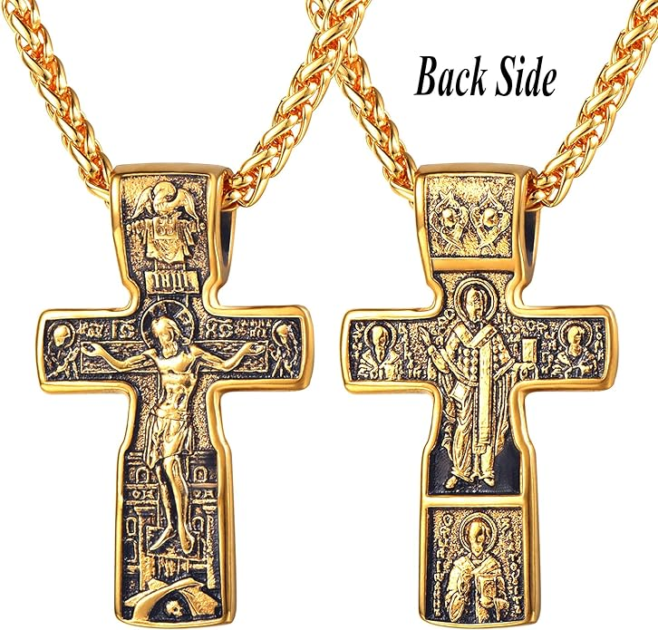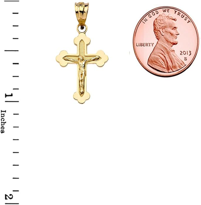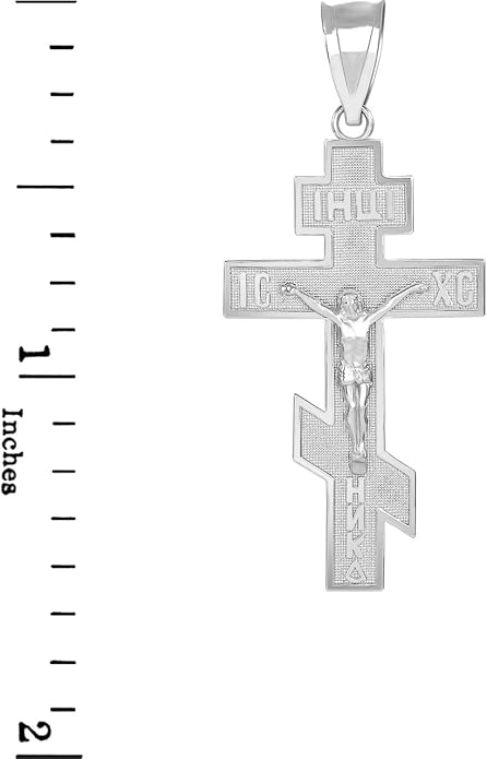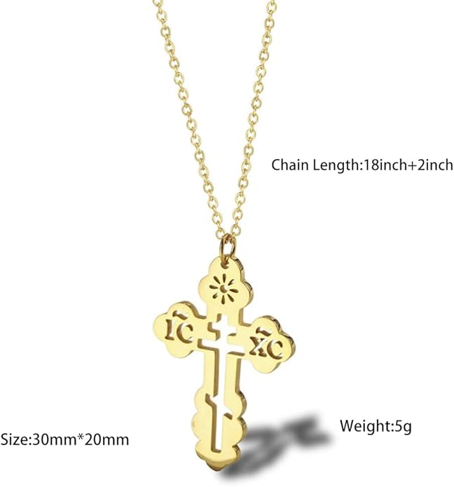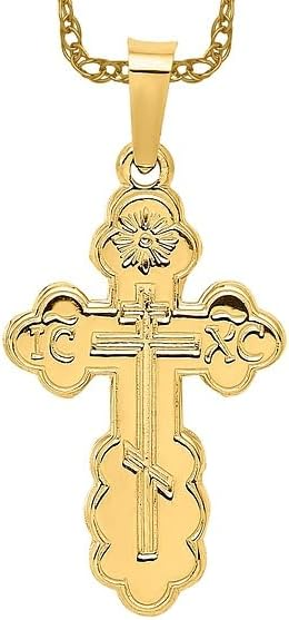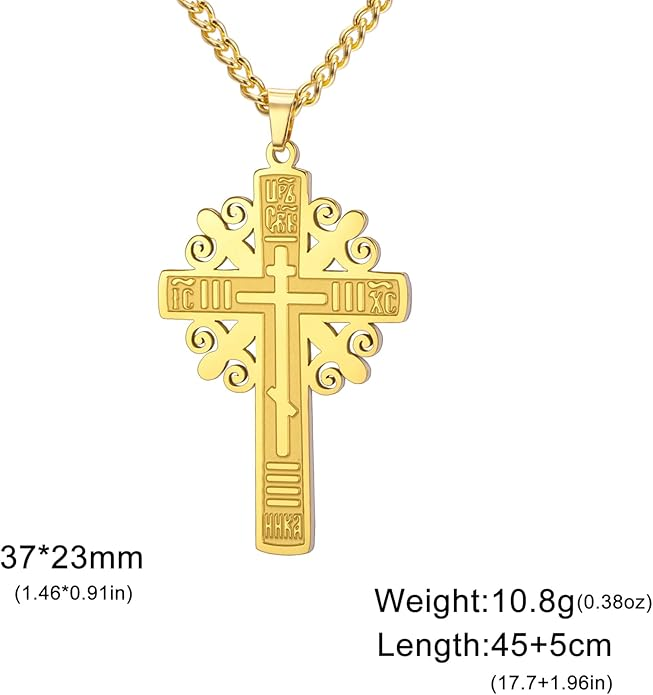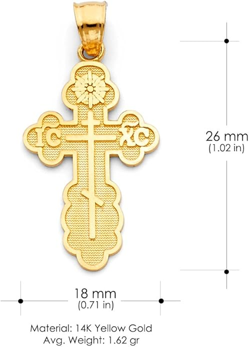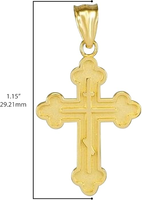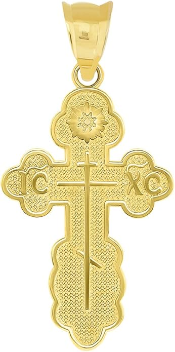 With its refined craftsmanship and graceful size, this crucifix is an excellent choice for a child or for anyone who prefers a subtle, yet meaningful, expression of their faith. A beautiful and blessed reminder of salvation to keep close every day.The sharp, pointed edges of this “Passion” crucifix are artistically intentional, evoking the piercing sorrow of the Crucifixion. Its intricate, cut-out design makes the solid gold feel both substantial and delicate, reminding us that Christ’s divine strength was revealed through profound vulnerability.The beauty of this linear crucifix lies in its profound simplicity. Its clean, contemporary lines present the timeless truth of the Cross with quiet confidence, reminding us that the most essential articles of faith require no ornamentation.The use of two-tone gold in this crucifix is deeply symbolic, reflecting the two natures of Christ. The radiant yellow gold of the Cross speaks to His divine glory, while the luminous white gold of the corpus represents His glorified human nature, uniting divinity and humanity in the ultimate act of love.The textured, almost rugged surface of this crucifix gives it a tangible sense of history and reality. It’s a reminder that the Cross was not an abstract symbol, but a physical object of wood and nails, and that our salvation was won through a real, historical event—a profound act of love etched into time itself.This crucifix, with its unique bark-like texture, beautifully evokes the image of the Cross as the Tree of Life. It serves as a powerful reminder that from the wood of Christ’s sacrifice, the fruit of eternal life is offered to all humanity.The delicate, lace-like border of this crucifix frames the central image of Christ’s sacrifice, much like an ornate frame enhances a masterpiece. This detail reminds us that the Crucifixion, though an event of immense suffering, is also the Church’s most treasured and beautiful truth—a divine work of art that reveals the depth of God’s love for us.The distinct, rounded ends of this crucifix soften its otherwise stark geometry, subtly reminding us of the gentle and approachable nature of Christ. It speaks to the truth that even in the midst of suffering, His divine love embraces the world with tenderness and compassion.The trefoil ends of this crucifix, resembling three budding leaves, are a beautiful and classic symbol of the Holy Trinity. Each point reminds us that the act of salvation on the Cross is the work of the Father, the Son, and the Holy Spirit, united in their love for humanity.The brilliant, polished finish of this golden crucifix reflects the light, serving as a visual metaphor for Christ as the “Light of the World.” It’s a humble yet powerful reminder that His teachings illuminate our path, and His sacrifice dispels the darkness of sin, guiding us toward the eternal light of the Heavenly Kingdom.This three-bar cross is a profound summary of the Gospel story, rich in theological meaning. The top bar represents the plaque bearing Christ’s inscription, the middle bar is for His outstretched arms, embracing all of humanity, and the slanted footrest below speaks a silent sermon: it points up, toward Paradise for the repentant, and down, toward condemnation for the unrepentant, reminding us that the Cross is the ultimate moral crossroads for every human soul.This crucifix is beautifully designed for both public witness and private devotion. While the front proclaims the central truth of our salvation for all to see, the prayer inscribed on the back rests against the heart—a silent, constant, and personal conversation with God that you carry throughout your day.A baptismal cross is the first piece of spiritual armor a new Christian receives. In the Orthodox tradition, this cross isn’t just a gift; it is a seal of faith and a shield for the soul as it begins its lifelong journey. Its simple, unadorned design is a powerful reminder that the unblemished victory of Christ is the only defense we truly need.This cross harmoniously combines two shades of gold, and this is not just an artistic device, but a profound theological symbol. The two colors of the metal visually remind us of the two natures of Jesus Christ—divine and human—united in Him “inseparably, unchangeably, inseparably.” This small work of art is a silent sermon on the greatest mystery of the Incarnation, which we carry close to our hearts.The striking contrast between the yellow and white gold on this crucifix is a powerful visual sermon on the dual nature of Christ. The radiant yellow gold speaks of His eternal divinity and heavenly glory, while the pure white gold represents His sinless human nature, taken on for our salvation. This cross is a beautiful reminder that in Christ, God and Man are perfectly and indivably united.This cross, in its elegant simplicity, beautifully articulates a core tenet of Orthodox theology. The absence of the corpus (the body of Christ) is a deliberate and powerful statement: we venerate the Cross not as an instrument of death, but as an emblem of Christ’s ultimate victory. It is an empty throne, a sign of the Resurrection, reminding us that our faith is founded not on a tragedy, but on the triumphant, life-giving power of our risen Lord.This cross is beautifully rendered as an outline, a visual echo of the empty tomb. It reminds us that our faith is defined not by an absence, but by the glorious and life-giving presence of the Risen Christ, whose victory gives shape and meaning to our world. The trefoil design at the ends of this cross adds a layer of Trinitarian theology to the central message of the Crucifixion. It’s a subtle but powerful reminder that our salvation flows from the perfect love and unity of the Father, Son, and Holy Spirit—a divine plan of redemption in which each Person of the Trinity participates.This crucifix’s small and slender profile is reminiscent of a key. And indeed, the Cross is the master ke