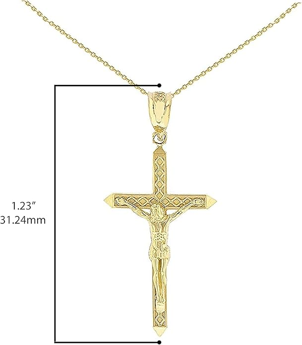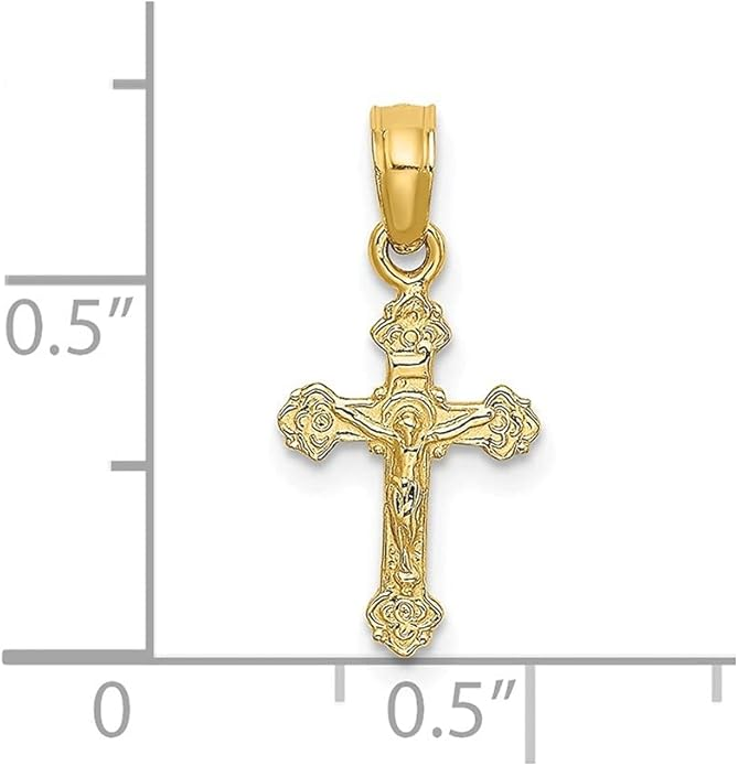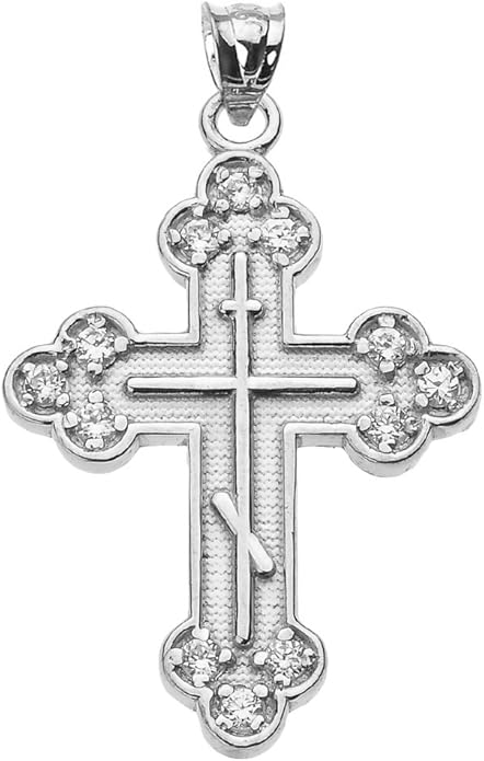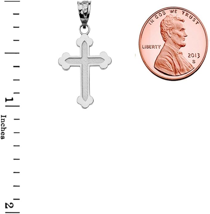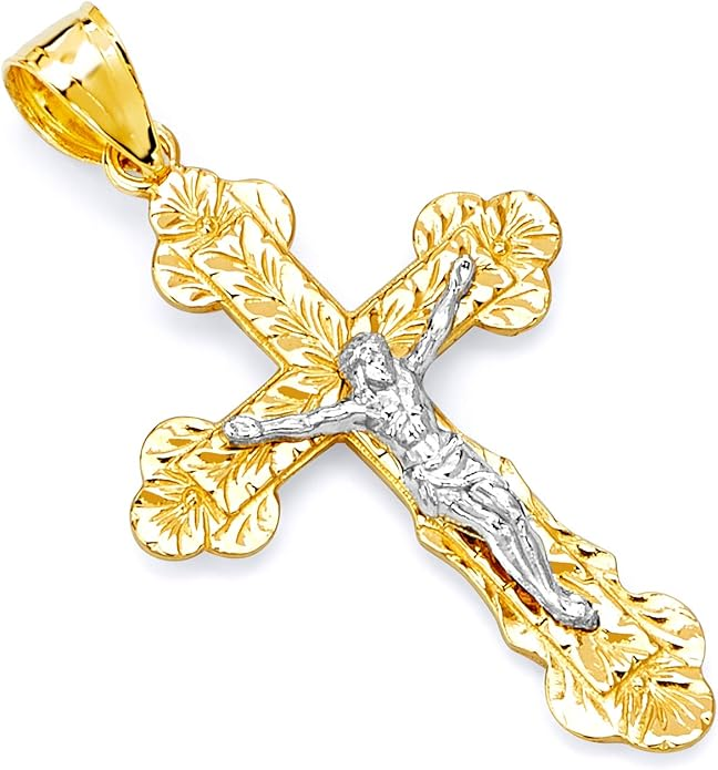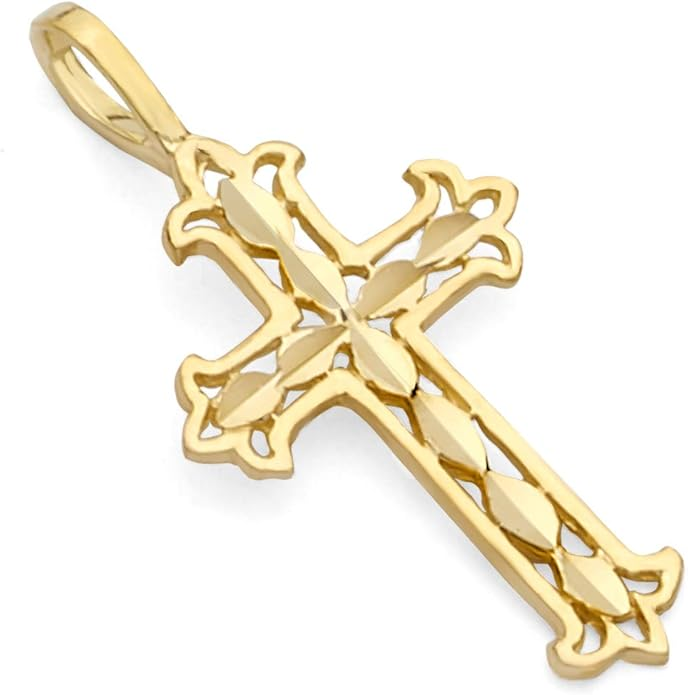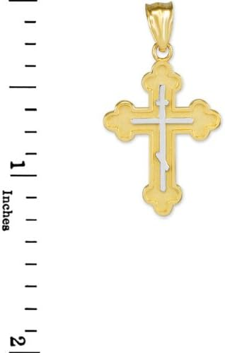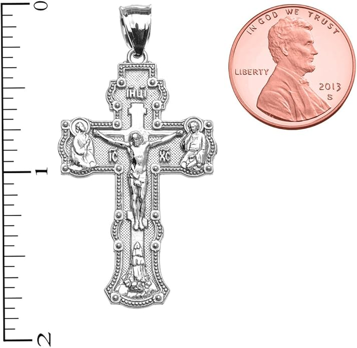 With its refined craftsmanship and graceful size, this crucifix is an excellent choice for a child or for anyone who prefers a subtle, yet meaningful, expression of their faith. A beautiful and blessed reminder of salvation to keep close every day.The sharp, pointed edges of this “Passion” crucifix are artistically intentional, evoking the piercing sorrow of the Crucifixion. Its intricate, cut-out design makes the solid gold feel both substantial and delicate, reminding us that Christ’s divine strength was revealed through profound vulnerability.The beauty of this linear crucifix lies in its profound simplicity. Its clean, contemporary lines present the timeless truth of the Cross with quiet confidence, reminding us that the most essential articles of faith require no ornamentation.The use of two-tone gold in this crucifix is deeply symbolic, reflecting the two natures of Christ. The radiant yellow gold of the Cross speaks to His divine glory, while the luminous white gold of the corpus represents His glorified human nature, uniting divinity and humanity in the ultimate act of love.The textured, almost rugged surface of this crucifix gives it a tangible sense of history and reality. It’s a reminder that the Cross was not an abstract symbol, but a physical object of wood and nails, and that our salvation was won through a real, historical event—a profound act of love etched into time itself.This crucifix, with its unique bark-like texture, beautifully evokes the image of the Cross as the Tree of Life. It serves as a powerful reminder that from the wood of Christ’s sacrifice, the fruit of eternal life is offered to all humanity.The delicate, lace-like border of this crucifix frames the central image of Christ’s sacrifice, much like an ornate frame enhances a masterpiece. This detail reminds us that the Crucifixion, though an event of immense suffering, is also the Church’s most treasured and beautiful truth—a divine work of art that reveals the depth of God’s love for us.The distinct, rounded ends of this crucifix soften its otherwise stark geometry, subtly reminding us of the gentle and approachable nature of Christ. It speaks to the truth that even in the midst of suffering, His divine love embraces the world with tenderness and compassion.The trefoil ends of this crucifix, resembling three budding leaves, are a beautiful and classic symbol of the Holy Trinity. Each point reminds us that the act of salvation on the Cross is the work of the Father, the Son, and the Holy Spirit, united in their love for humanity.The brilliant, polished finish of this golden crucifix reflects the light, serving as a visual metaphor for Christ as the “Light of the World.” It’s a humble yet powerful reminder that His teachings illuminate our path, and His sacrifice dispels the darkness of sin, guiding us toward the eternal light of the Heavenly Kingdom.This three-bar cross is a profound summary of the Gospel story, rich in theological meaning. The top bar represents the plaque bearing Christ’s inscription, the middle bar is for His outstretched arms, embracing all of humanity, and the slanted footrest below speaks a silent sermon: it points up, toward Paradise for the repentant, and down, toward condemnation for the unrepentant, reminding us that the Cross is the ultimate moral crossroads for every human soul.This crucifix is beautifully designed for both public witness and private devotion. While the front proclaims the central truth of our salvation for all to see, the prayer inscribed on the back rests against the heart—a silent, constant, and personal conversation with God that you carry throughout your day.A baptismal cross is the first piece of spiritual armor a new Christian receives. In the Orthodox tradition, this cross isn’t just a gift; it is a seal of faith and a shield for the soul as it begins its lifelong journey. Its simple, unadorned design is a powerful reminder that the unblemished victory of Christ is the only defense we truly need.This cross harmoniously combines two shades of gold, and this is not just an artistic device, but a profound theological symbol. The two colors of the metal visually remind us of the two natures of Jesus Christ—divine and human—united in Him “inseparably, unchangeably, inseparably.” This small work of art is a silent sermon on the greatest mystery of the Incarnation, which we carry close to our hearts.The striking contrast between the yellow and white gold on this crucifix is a powerful visual sermon on the dual nature of Christ. The radiant yellow gold speaks of His eternal divinity and heavenly glory, while the pure white gold represents His sinless human nature, taken on for our salvation. This cross is a beautiful reminder that in Christ, God and Man are perfectly and indivably united.This cross, in its elegant simplicity, beautifully articulates a core tenet of Orthodox theology. The absence of the corpus (the body of Christ) is a deliberate and powerful statement: we venerate the Cross not as an instrument of death, but as an emblem of Christ’s ultimate victory. It is an empty throne, a sign of the Resurrection, reminding us that our faith is founded not on a tragedy, but on the triumphant, life-giving power of our risen Lord.This cross is beautifully rendered as an outline, a visual echo of the empty tomb. It reminds us that our faith is defined not by an absence, but by the glorious and life-giving presence of the Risen Christ, whose victory gives shape and meaning to our world. The trefoil design at the ends of this cross adds a layer of Trinitarian theology to the central message of the Crucifixion. It’s a subtle but powerful reminder that our salvation flows from the perfect love and unity of the Father, Son, and Holy Spirit—a divine plan of redemption in which each Person of the Trinity participates.This crucifix’s small and slender profile is reminiscent of a key. And indeed, the Cross is the master ke